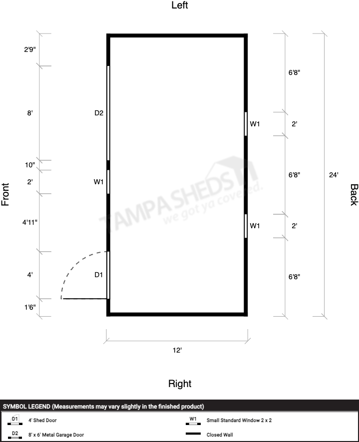| Doors | 4' Shed Door, Hinges Right, 8' x 6' Metal Garage Door |